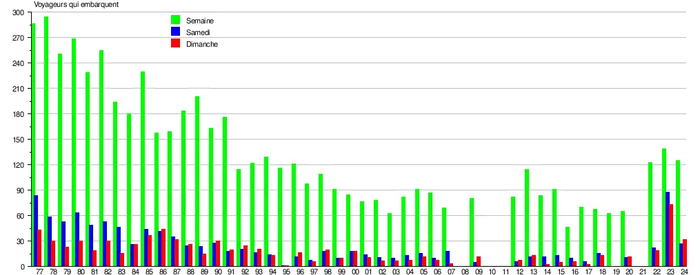 Le graphique et le tableau montrent le nombre de passagers qui en moyenne embarquent durant la semaine, le samedi et le dimanche[8].