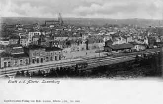 La station d'Esch-sur-Alzette est mise en service le [3] par la Compagnie des chemins de fer de l'Est, exploitant du réseau de la Société royale grand-ducale des chemins de fer Guillaume-Luxembourg, lors de l'ouverture à l'exploitation de la ligne de Bettembourg à Esch-sur-Alzette. Cette première gare dispose d'un bâtiment construit en 1859 rue Saint-Antoine[4].
