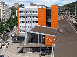 Vue des voies de la gare en 2018 avec, en rouge, l'auberge de jeunesse et, en gris et blanc, le nouveau bâtiment voyageurs. | |