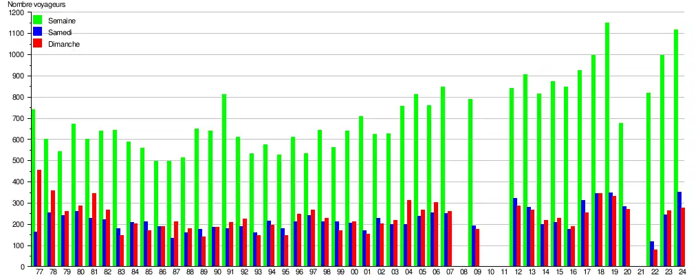 Ce graphique et tableau montre le nombre de voyageurs embarquant en moyenne durant la semaine, le samedi et le dimanche[7].