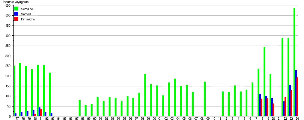 Ce graphique et tableau montre le nombre de voyageurs embarquant en moyenne durant la semaine, le samedi et le dimanche[11].