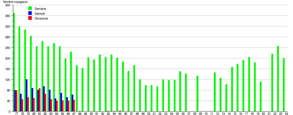 Ce graphique et tableau montre le nombre de voyageurs embarquant en moyenne durant la semaine, le samedi et le dimanche[9].