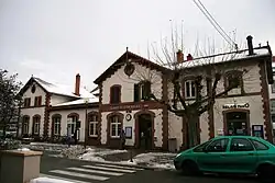 Le bâtiment voyageurs, agrandi au cours du temps, se compose de deux pavillons aux dimensions inégales comportant chacun deux travées sous un toit à arrête transversale avec des fermes de charpente extérieures et un œil-de-bœuf à chaque pignon, lesquels encadrent une aile sans étage de trois travées avec, à l'extrémité droite, une aile à étage comportant deux travées avec un œil-de-bœuf au pignon. La façade est revêtue de crépi avec des chaînages d'angle et des bandeaux réalisés en pierre de taille (grès).