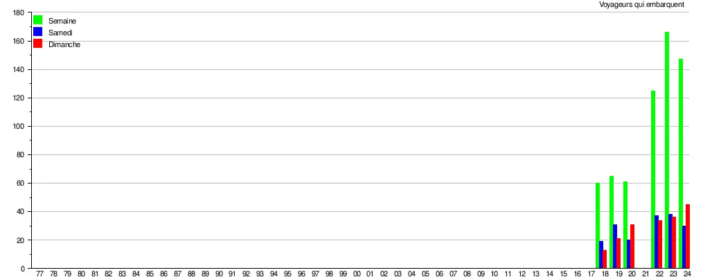 Le graphique et le tableau montrent le nombre de passagers qui en moyenne embarquent durant la semaine, le samedi et le dimanche[7].
