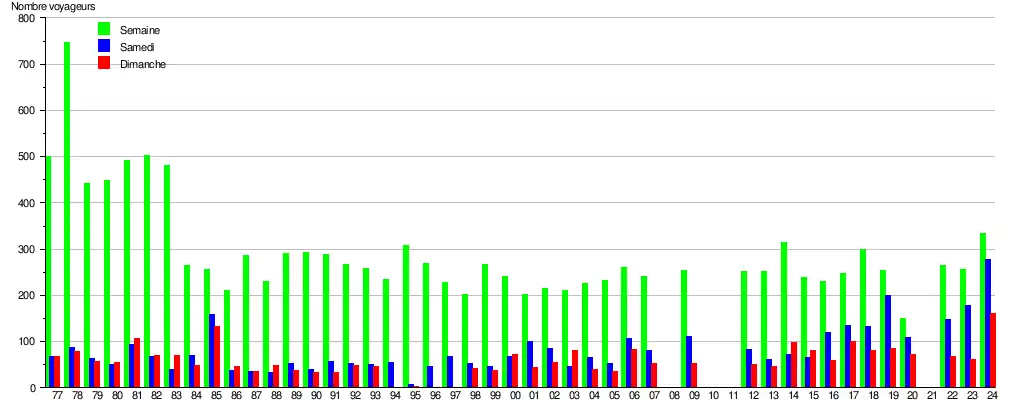 Ce graphique et tableau montre le nombre de voyageurs embarquant en moyenne durant la semaine, le samedi et le dimanche[14].