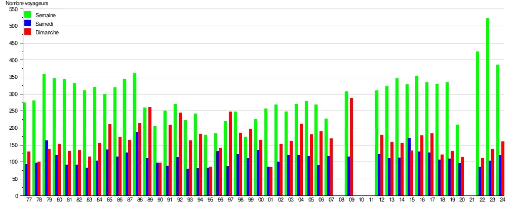 Ce graphique et tableau montre le nombre de voyageurs embarquant en moyenne durant la semaine, le samedi et le dimanche[10].