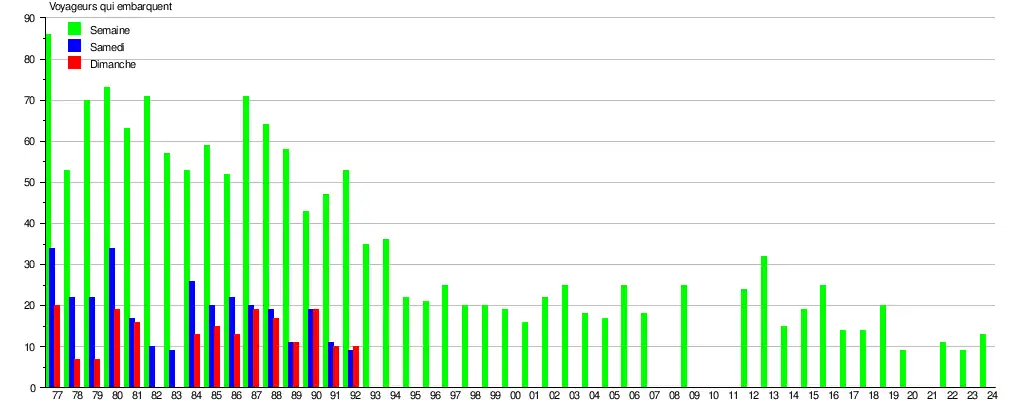 Le graphique et le tableau montrent le nombre de passagers qui en moyenne embarquent durant la semaine, le samedi et le dimanche[3].