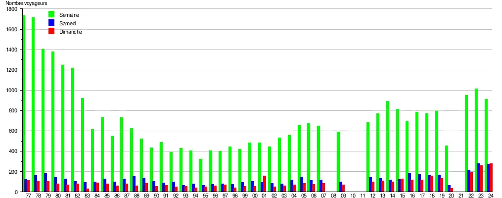 Ce graphique et tableau montre le nombre de voyageurs embarquant en moyenne durant la semaine, le samedi et le dimanche[16].