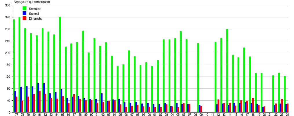 Le graphique et le tableau montrent le nombre de passagers qui en moyenne embarquent durant la semaine, le samedi et le dimanche[22].