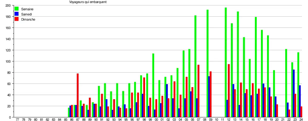 Le graphique et le tableau montrent le nombre de passagers qui en moyenne embarquent durant la semaine, le samedi et le dimanche[2].