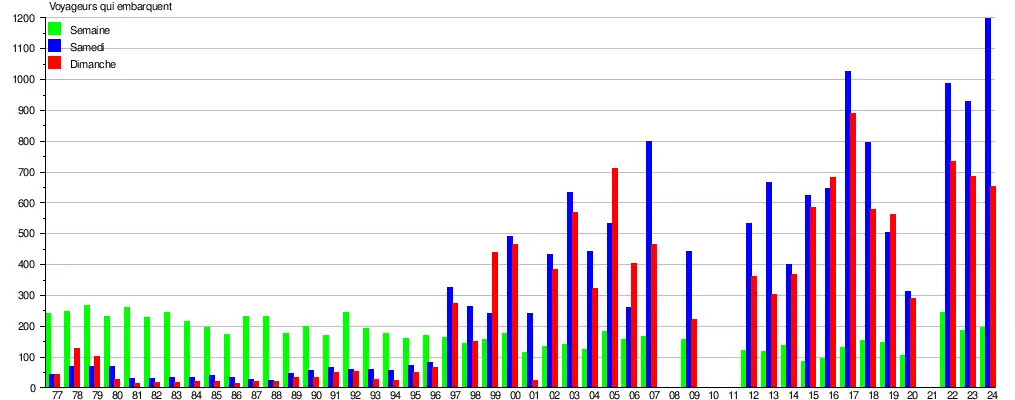 Le graphique et le tableau montrent le nombre de passagers qui en moyenne embarquent durant la semaine, le samedi et le dimanche[6].