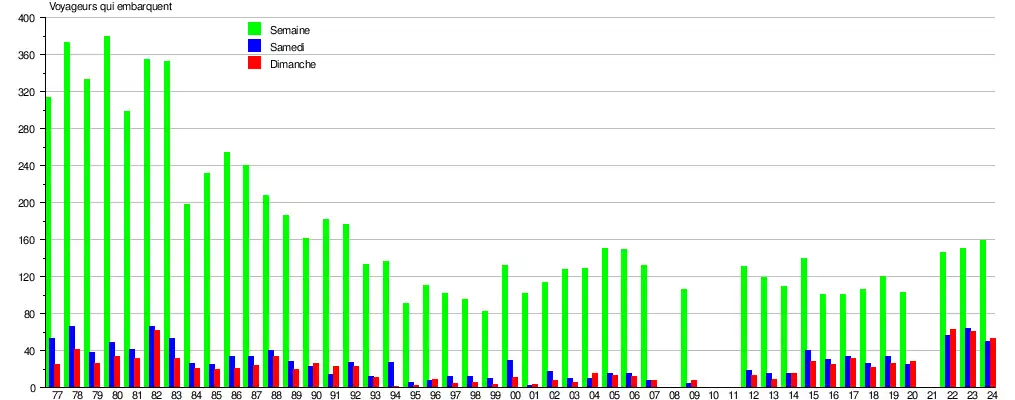 Le graphique et le tableau montrent le nombre de passagers qui en moyenne embarquent durant la semaine, le samedi et le dimanche[8].