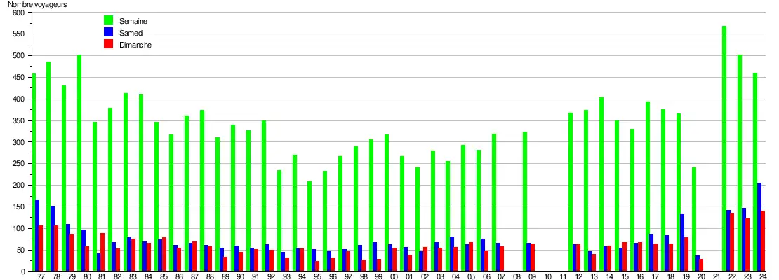 Ce graphique et tableau montre le nombre de voyageurs embarquant en moyenne durant la semaine, le samedi et le dimanche[9].