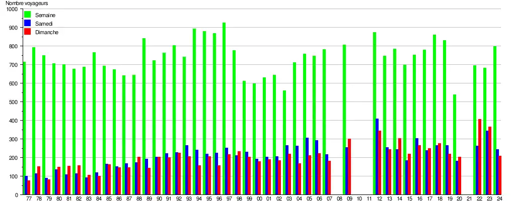 Ce graphique et tableau montre le nombre de voyageurs embarquant en moyenne durant la semaine, le samedi et le dimanche[8].
