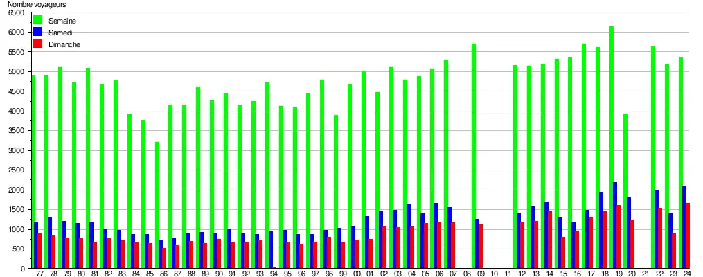 Ce graphique et tableau montre le nombre de voyageurs embarquant en moyenne durant la semaine, le samedi et le dimanche[13].
