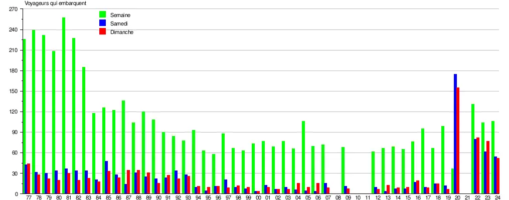 Le graphique et le tableau montrent le nombre de passagers qui en moyenne embarquent durant la semaine, le samedi et le dimanche[4].