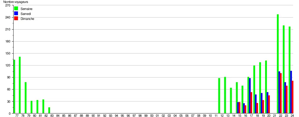 Ce graphique et tableau montre le nombre de voyageurs embarquant en moyenne durant la semaine, le samedi et le dimanche[7].