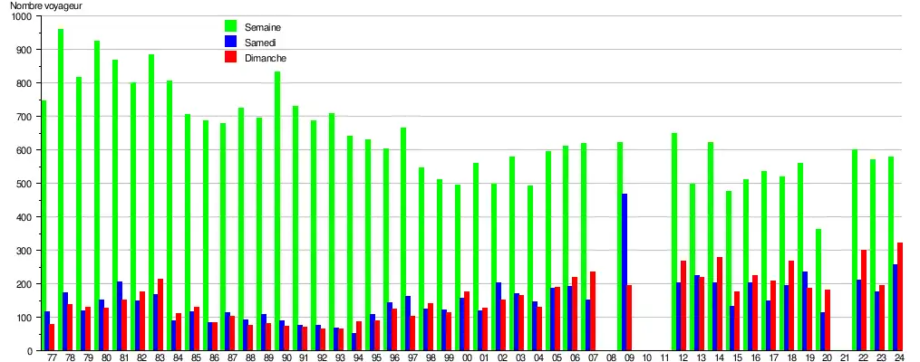 Ce graphique et tableau montre le nombre de voyageurs embarquant en moyenne durant la semaine, le samedi et le dimanche[7].