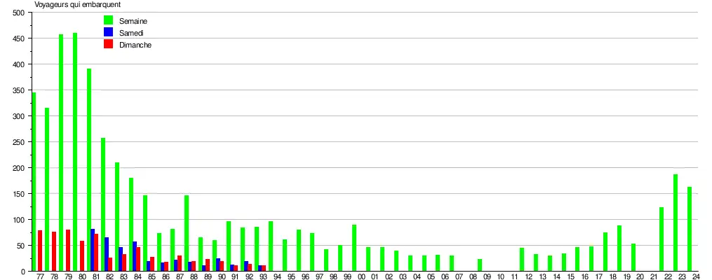 Le graphique et le tableau montrent le nombre de passagers qui en moyenne embarquent durant la semaine, le samedi et le dimanche[12].