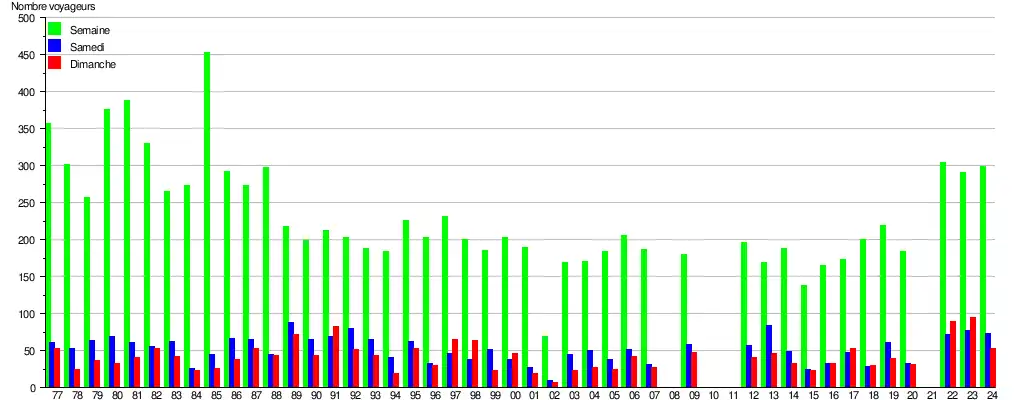 Ce graphique et tableau montre le nombre de voyageurs embarquant en moyenne durant la semaine, le samedi et le dimanche[9].