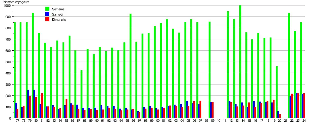 Ce graphique et tableau montre le nombre de voyageurs embarquant en moyenne durant la semaine, le samedi et le dimanche[11].
