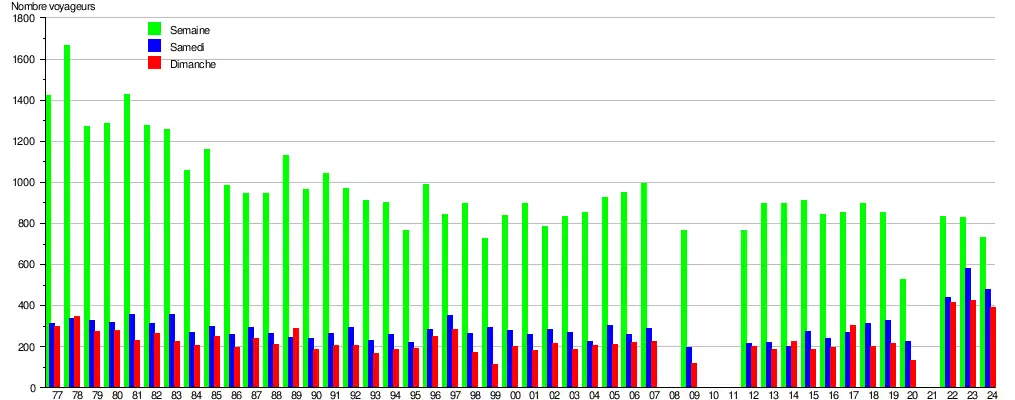 Ce graphique et tableau montre le nombre de voyageurs embarquant en moyenne durant la semaine, le samedi et le dimanche[5].