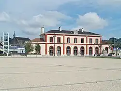 Intérieur de la gare avec train et bâtiment voyageurs. | |