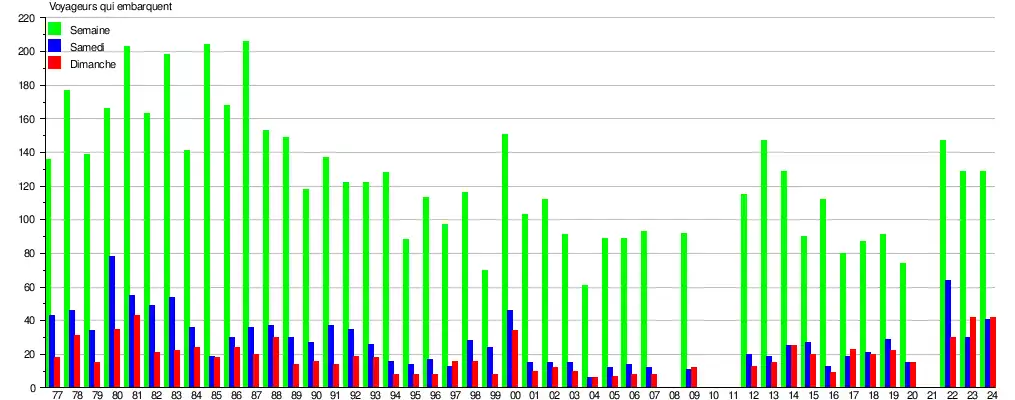 Le graphique et le tableau montrent le nombre de passagers qui en moyenne embarquent durant la semaine, le samedi et le dimanche[6].