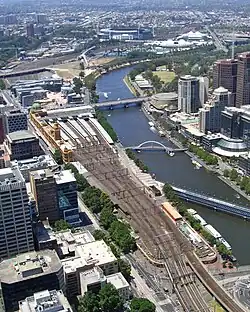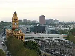 Les voies situées à l'est furent reconstruites en 1997-1998 pour préparer la place au Federation Square[28]. Jolimont Yard fut supprimé, 40 millions de dollars étant dépensés pour réduire les 53 lignes d'exploitation entre Flinders Street et la gare de Richmond à seulement 12. Le nombre d'aiguillages fut aussi réduit, passant de 164 à 48[29]. Ces changements concernèrent aussi la réaffectation de l'utilisation des quais de la gare, les trains régionaux passant du quai no 1 au no 10, et les trains du groupe de Clifton Hill ((les lignes d'Hurstbridge et d'Epping) étant déplacés de Princes Bridge au quai no 1. Les quais avaient été renumérotés lors de la fusion officielle des gares de Princes Bridge et de Flinders street le [30].