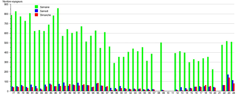 Ce graphique et tableau montre le nombre de voyageurs embarquant en moyenne durant la semaine, le samedi et le dimanche[11].
