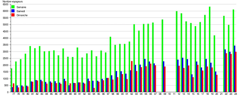 Ce graphique et tableau montre le nombre de voyageurs embarquant en moyenne durant la semaine, le samedi et le dimanche[15].