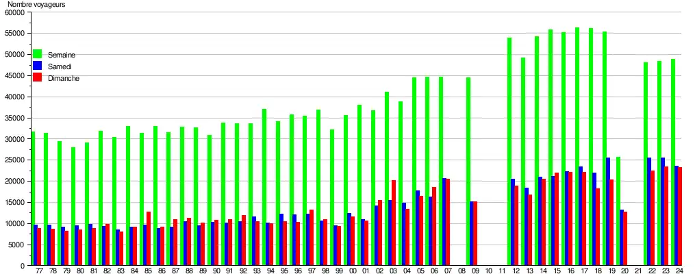 Ce graphique et tableau montre le nombre de voyageurs embarquant en moyenne durant la semaine, le samedi et le dimanche[5].