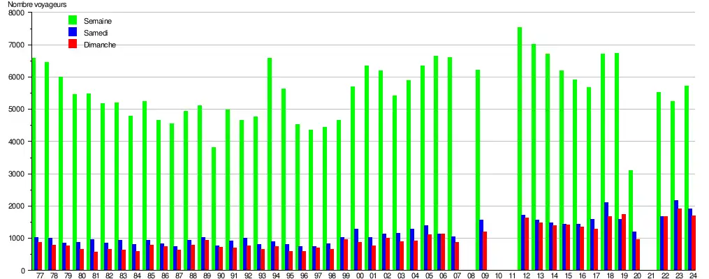 Ce graphique et tableau montre le nombre de voyageurs embarquant en moyenne durant la semaine, le samedi et le dimanche[12].