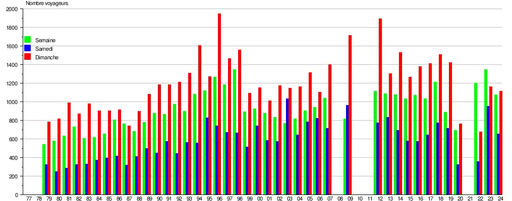 Ce graphique et tableau montre le nombre de voyageurs embarquant en moyenne durant la semaine, le samedi et le dimanche[7].