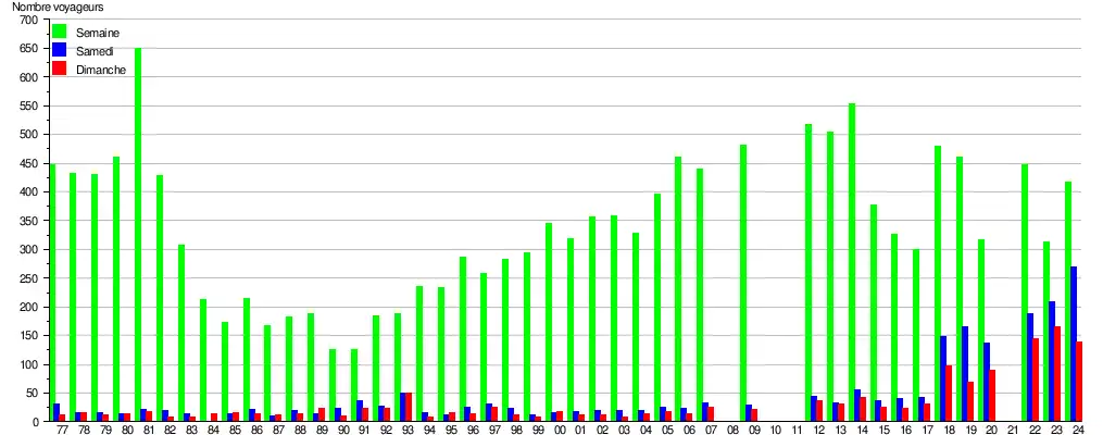 Ce graphique et tableau montre le nombre de voyageurs embarquant en moyenne durant la semaine, le samedi et le dimanche[7].