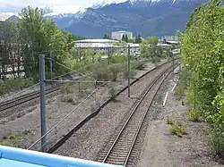 Vestiges de la gare, représentés par le quai central et le quai Nord le long des deux voies de la ligne de Grenoble à Montmélian (vue en direction de l'est). | |