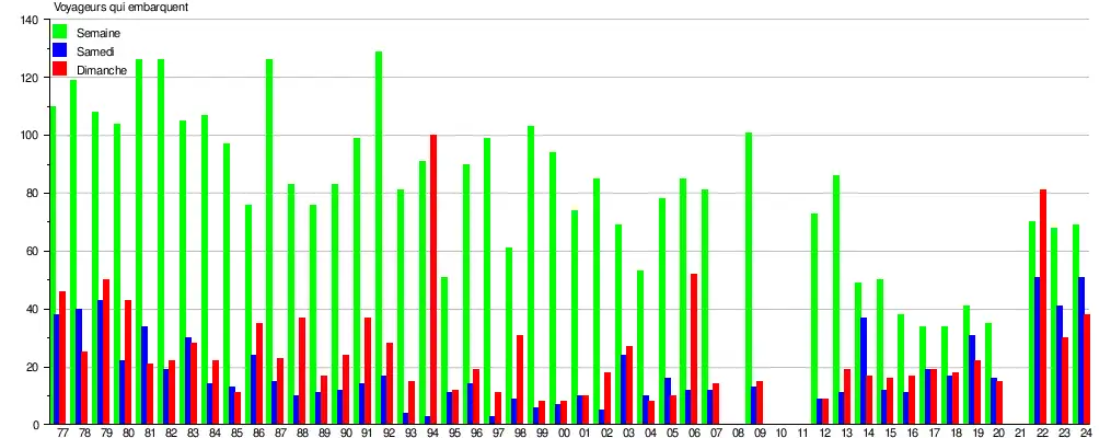Le graphique et le tableau montrent le nombre de passagers qui en moyenne embarquent durant la semaine, le samedi et le dimanche[11].