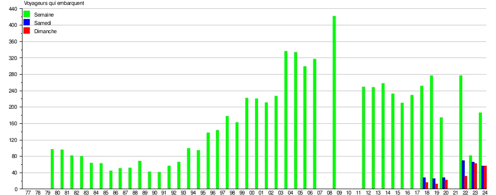Le graphique et le tableau montrent le nombre de passagers qui en moyenne embarquent durant la semaine, le samedi et le dimanche[10].