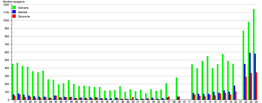 Ce graphique et tableau montre le nombre de voyageurs embarquant en moyenne durant la semaine, le samedi et le dimanche[12].