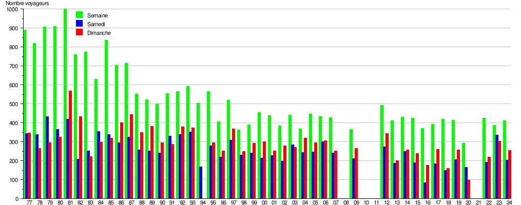 Ce graphique et tableau montre le nombre de voyageurs embarquant en moyenne durant la semaine, le samedi et le dimanche[12].