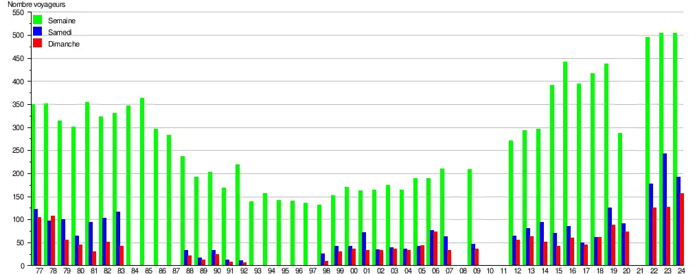 Ce graphique et tableau montre le nombre de voyageurs embarquant en moyenne durant la semaine, le samedi et le dimanche[7].