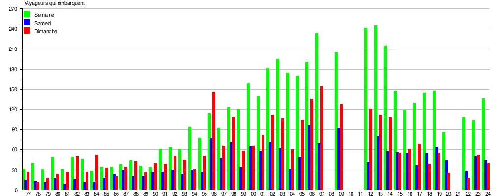 Le graphique et le tableau montrent le nombre de passagers qui en moyenne embarquent durant la semaine, le samedi et le dimanche[4].
