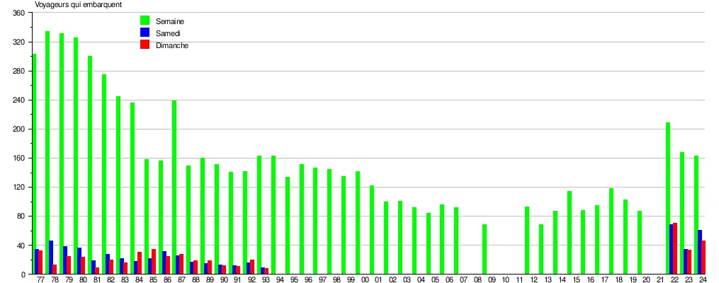 Le graphique et le tableau montrent le nombre de passagers qui en moyenne embarquent durant la semaine, le samedi et le dimanche[5].