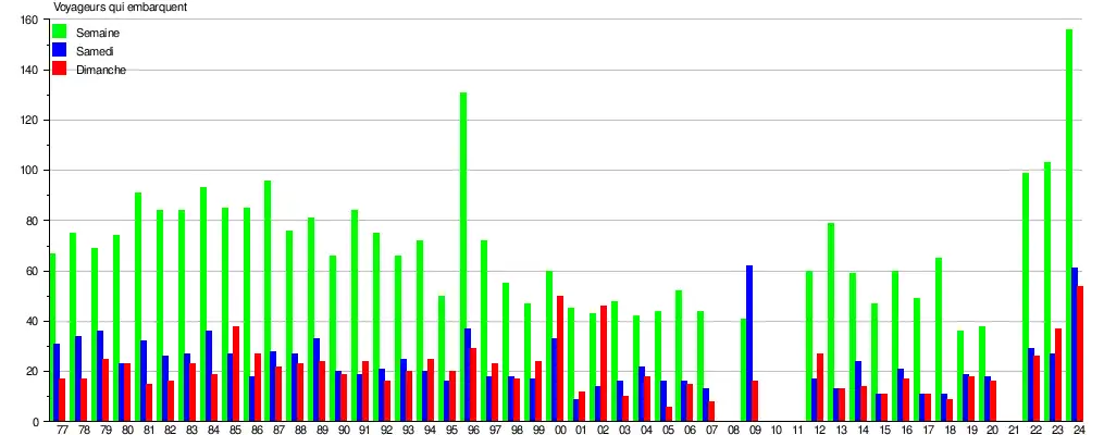 Le graphique et le tableau montrent le nombre de passagers qui en moyenne embarquent durant la semaine, le samedi et le dimanche[7].