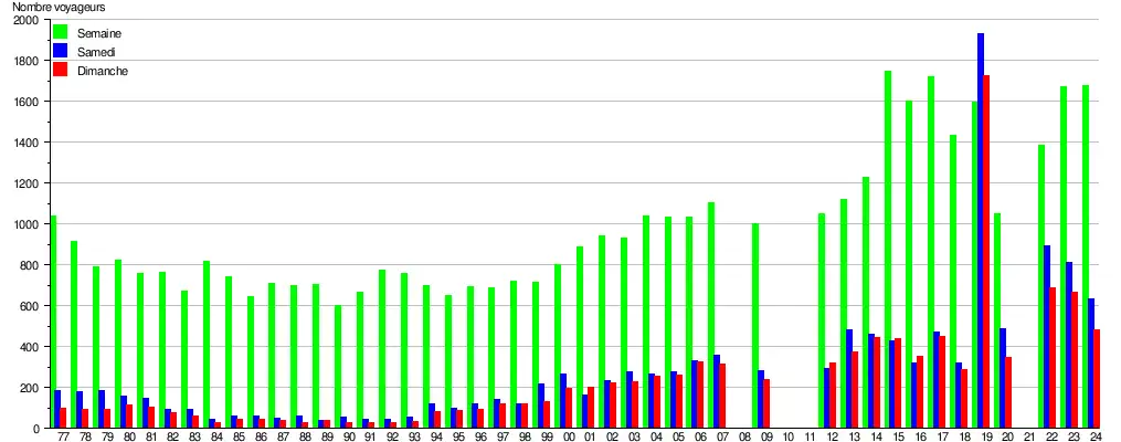 Ce graphique et tableau montre le nombre de voyageurs embarquant en moyenne durant la semaine, le samedi et le dimanche[9].
