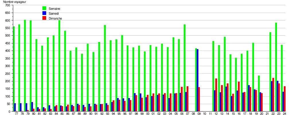Ce graphique et tableau montre le nombre de voyageurs embarquant en moyenne durant la semaine, le samedi et le dimanche[7].