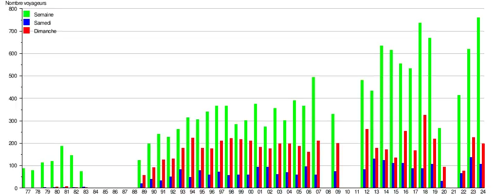 Ce graphique et tableau montre le nombre de voyageurs embarquant en moyenne durant la semaine, le samedi et le dimanche[3].