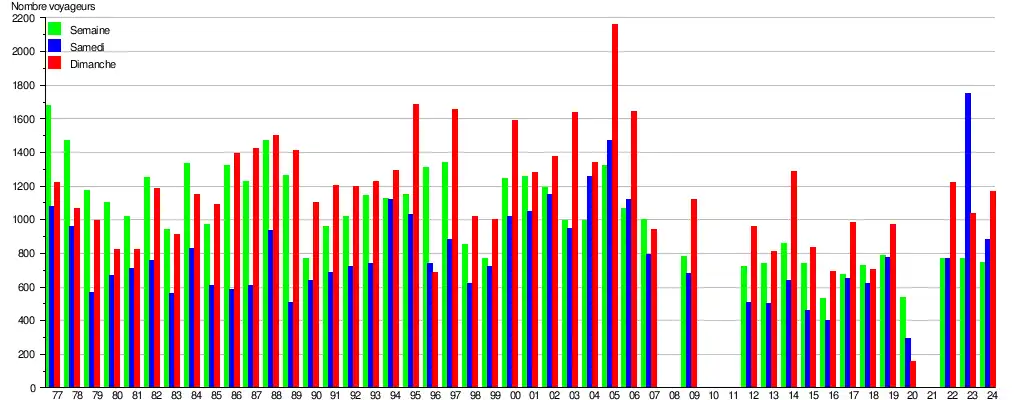 Ces graphique et tableau montrent le nombre de voyageurs embarquant en moyenne durant la semaine, le samedi et le dimanche[10].