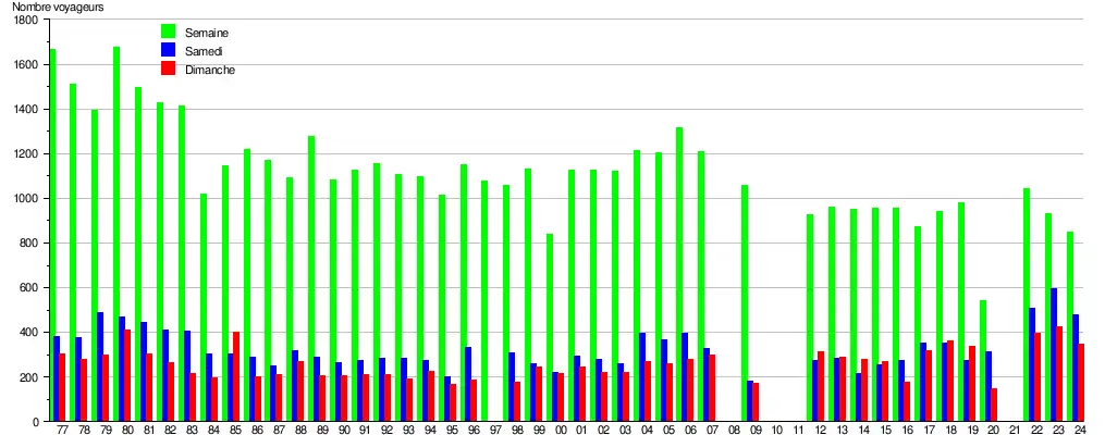 Ce graphique et tableau montre le nombre de voyageurs embarquant en moyenne durant la semaine, le samedi et le dimanche[3].