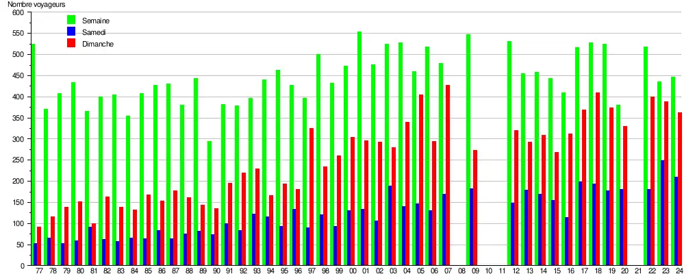 Ce graphique et tableau montre le nombre de voyageurs embarquant en moyenne durant la semaine, le samedi et le dimanche[12].